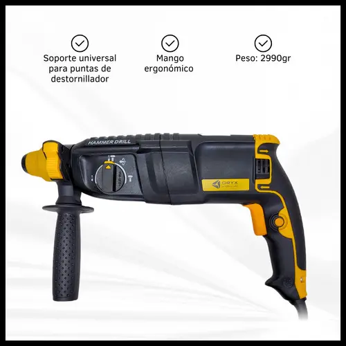 Características: • Potencia: 850W. • 1050/MIN (RPM). • Barra de profundidad. • Mechas de 12, 10 9 y 8. • Energía de impacto: 3.2 J. • Cincel punta y cincel plano. • Incluye maletín de guardado. • Nivele sonoro de 91 db(A) a 104 db(A). • Ideal para hacer cualquier tipo de trabajo. • Perfora: Hormigón: 26mm /Madera 30 mm /Acero: 13 mm.