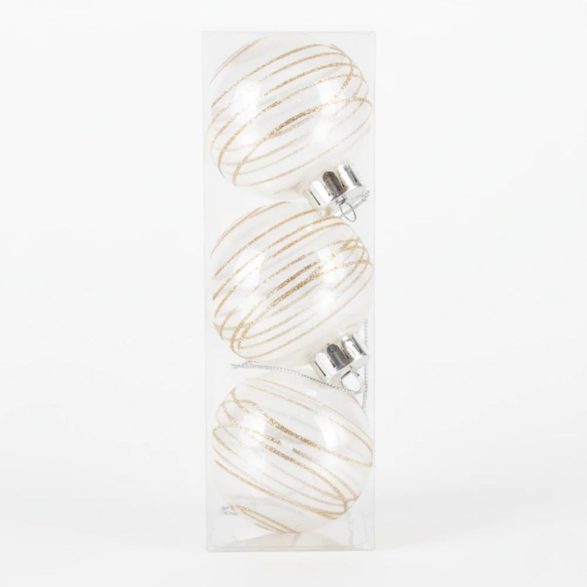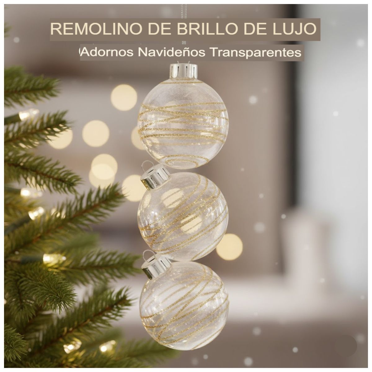 ¡Dale un toque de lujo y sofisticación a tu árbol esta Navidad! Este Set x 3 Esferas Navideñas Transparentes cuenta con un elegante diseño de remolino de brillo dorado en su interior. Son los adornos navideños transparentes perfectos para reflejar las luces de tu árbol, creando un remolino brilloso en cualquier ambiente.
