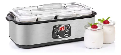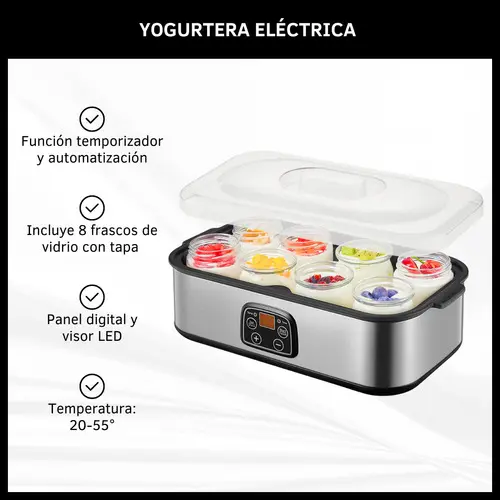 Características: - Temperatura: 20-55°, rango de temperatura ajustable para adaptarse a diversas recetas y tipos de yogurt. - Función temporizador y automatización, permite programar el tiempo de fermentación. - Incluye 8 frascos de vidrio con tapa, ideal para preparar diferentes sabores. - Panel digital y visor LED, facilita la selección de configuraciones. - Temperatura programable, ajustable según tus preferencias. - Capacidad de 1,4 L, 8 frascos con capacidad de 180 ml. - Eficiente en el consumo de energía. - Exterior de acero inoxidable. - Aviso sonoro al finalizar.